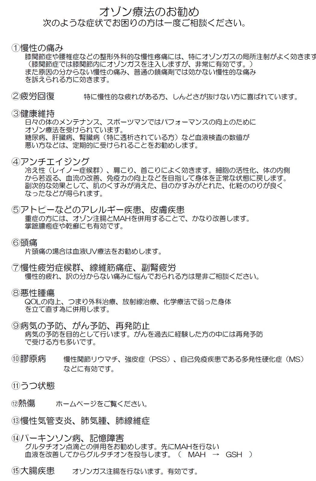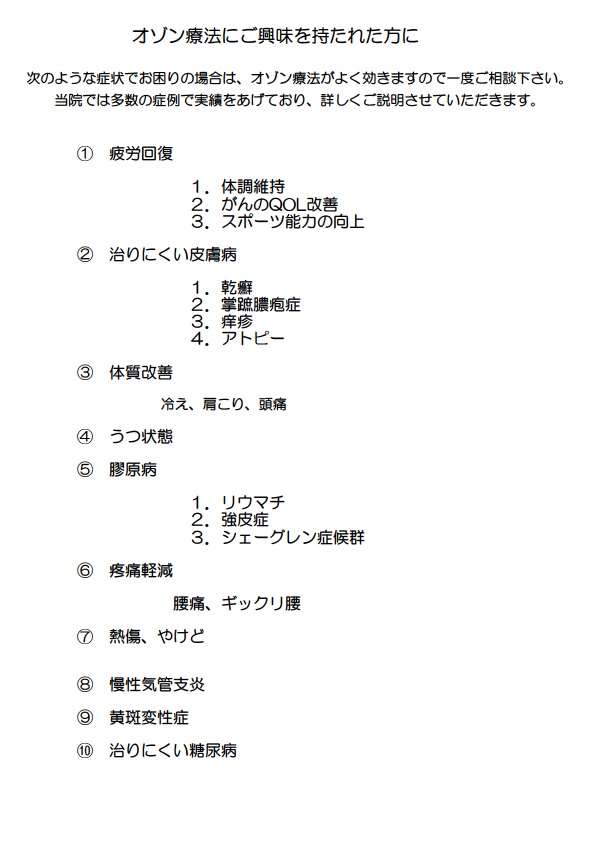 ・出血傾向 ※オゾンによる副作用 ・施行後にだるさ、頭痛を感じることがありますが、約12~24時間程度で改善されます。